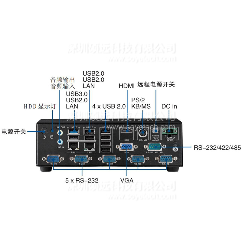 · -VGA,HAMI.2個Gbe LAN,7個USB 2.0,,1個USB 3.0,5個RS-232,1個RS-232/422/485